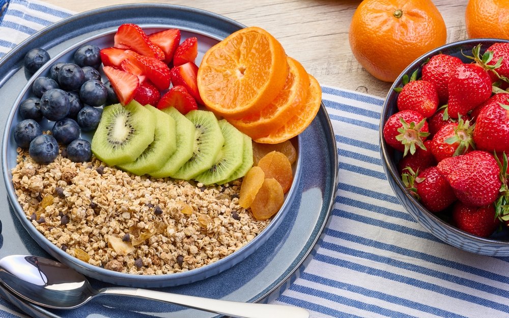 - Šviežių vaisių salotos. 2–3 puodeliai sezoniškų vaisių ir uogų mišinio – gaivus pasirinkimas, ypač jei renkatės sotesnius vaisius.