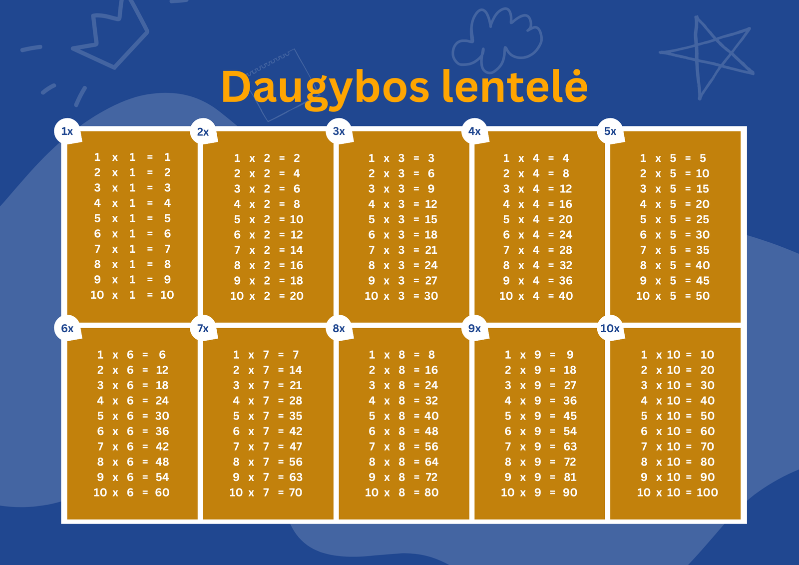 Daugybos lentelė nuo 1 iki 10