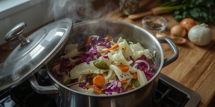 • Pagrindinis troškinimas: Kopūstai supilami į puodą ar keptuvę, papildomai įpilama truputis vandens arba sultinio, leidžiama švelniai virti ir garuoti uždengus.