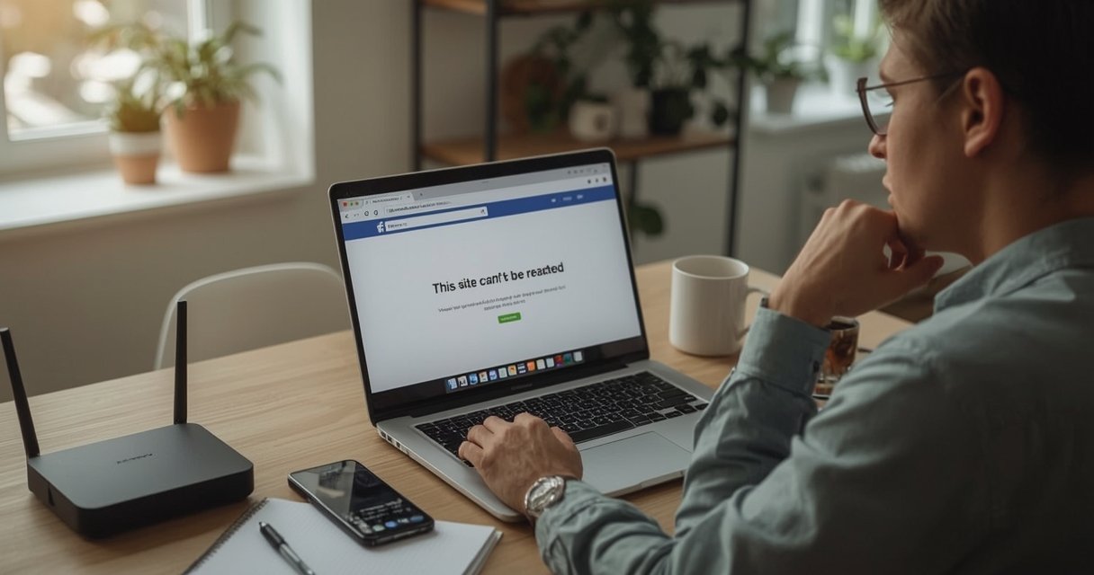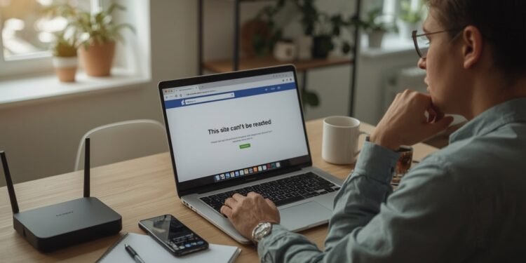 Labiausiai pastebimas trikdis yra visiškas svetainės ar programėlės nepasiekiamumas. Pabandžius įkelti Facebook, puslapis gali nerodyti jokio turinio, matysite tik klaidos pranešimą („This site can’t be reached“ ar panašų).